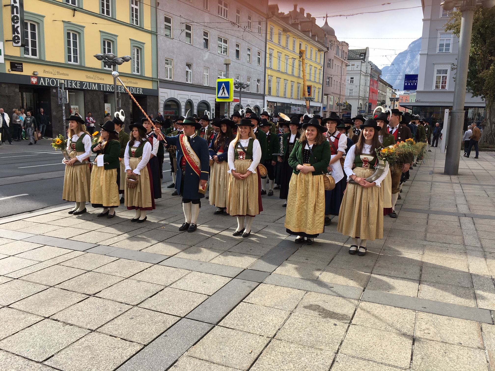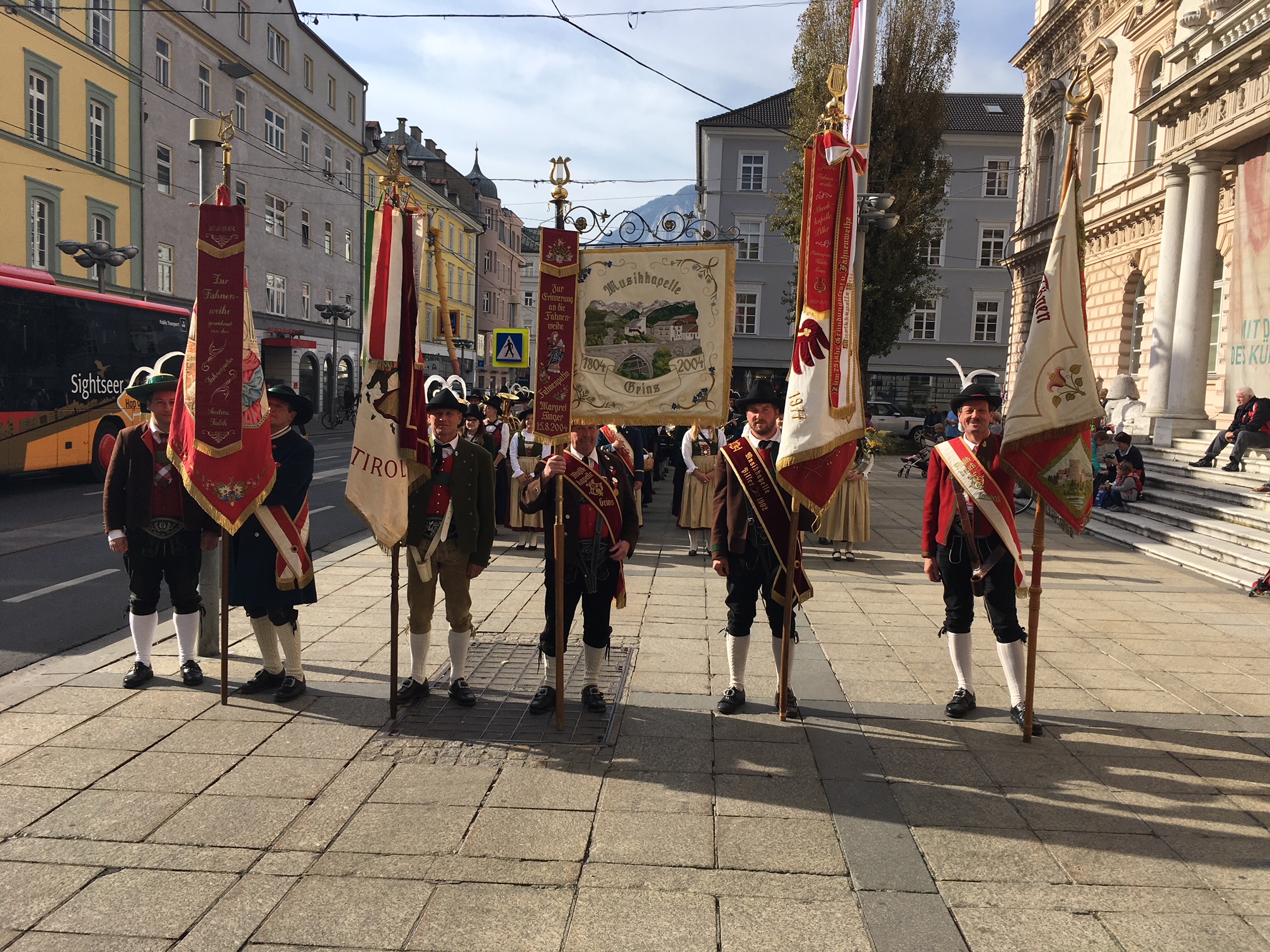 Unter Bezirksstabführer Lukas Spiss nahmen neben der Landecker Bezirksfahne vier Kapellenfahnen flankiert von den Bezirksobmännern aus Landeck und Imst sowie elf Marketenderinnen und einhundertsechs Musikantinnen und Musikanten aus beiden Musikbezirken beim Landesmuseum Ferdinandeum Aufstellung. Beim Standkonzert wurden Märsche zünftig aufgespielt. Pünktlich um 15:02 Uhr marschierte der Marschblock 3 mit den Kapellen Grins, St. Jakob a. A., Tösens und Pfunds gemeinsam mit der MK-Piller über die Meinhard-Straße zum Boznerplatz. Schließlich erreichte unser Musikzug über die Wilhelm Greil-Straße den Eduard Wallnöfer-Platz am Landhaus. Tausende Zuschauer begrüßten uns mit euphorischem Applaus und klatschten rhythmisch zu traditionellen Marschklängen.