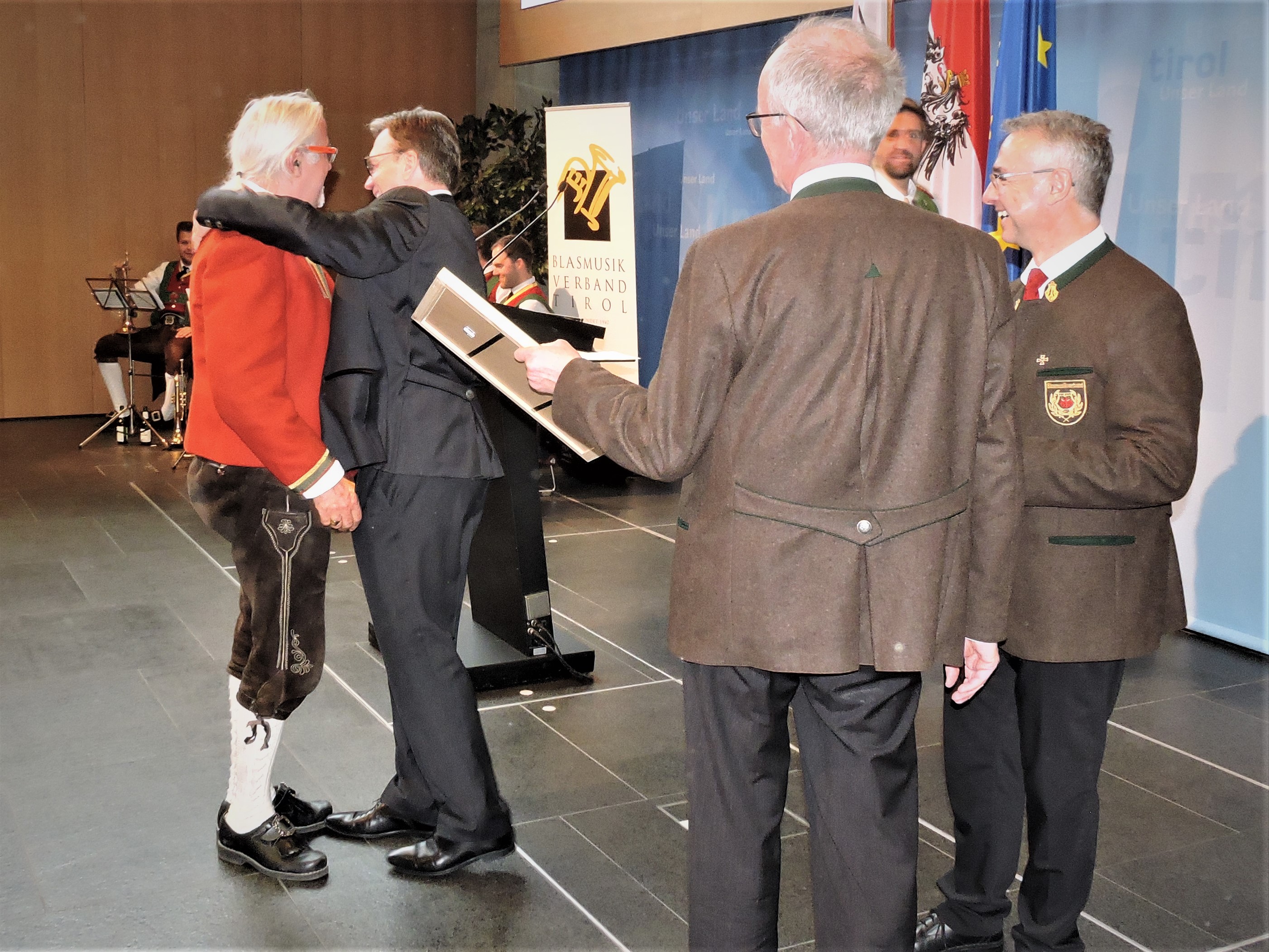 Die "Steinacher Bläser", welche schon die Messe in eindrucksvoller Klangqualität zum Besten gaben. Sie eröffneten den Festakt mit einer festlichen Fanfare. Landesverbandsobmann Elmar Juen bedankte sich bei den langjährigen Musikkameraden für ihre Dienste für die Blasmusik und weist auf eine gute Zusammenarbeit hin. Er nannte dabei auch ganz explizit den Tiroler Volksmusikverein mit den künftig gemeinsamen Projekten geplant sind. Unser Landeshauptmann unterstreicht die Großzügigkeit des Tiroler Landesmusikverband und erwähnt dabei den Leiter der Repräsentationsabteilung Thomas Saurer, welcher in Schützentracht durch den offiziellen Teil des Ehrentags führte. Günther Platter bedankt sich bei allen zu Ehrenden Musikanten und deren Frauen, die im Hintergrund dafür sorgen dass alles immer so reibungslos klappt und ihre Musikanten ordentlich und pünktlich zu den Proben und Ausrückungen geschickt werden. Ironisch betont er auch das pünktliche nach Hause kommen nach den Proben und Ausrückungen, was allen Zuhörern im Saal ein Lachen abringte. Nach den Festansprachen erfolgte die feierliche Überreichung der Abzeichen und Urkunden.