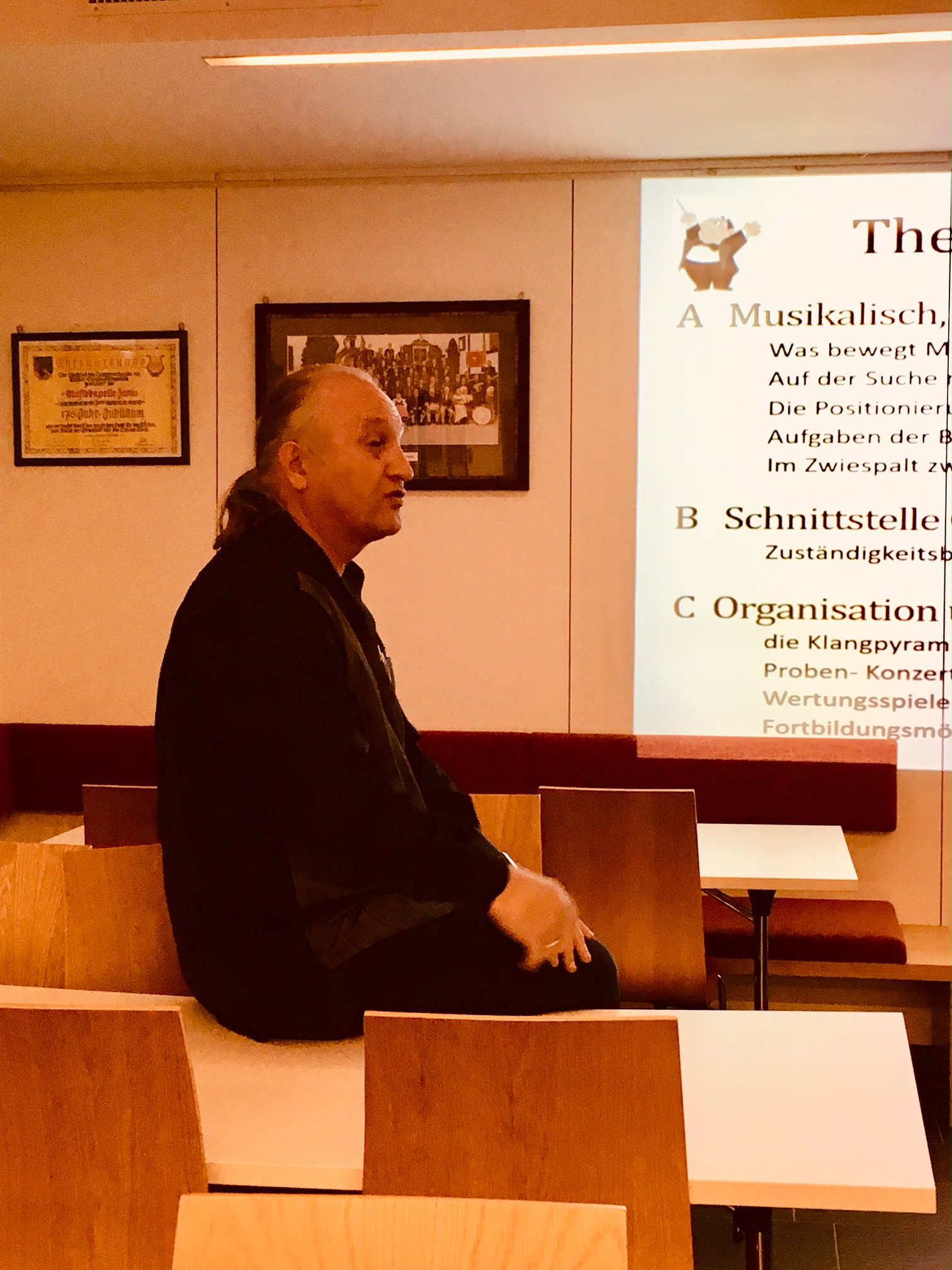 BO Florian Geiger referierte im 1. Teil über die Organisation sowie moderne und zeitgerechte Führungspraktiken in unseren Musikvereinen. Über allgemeine Zielsetzungen, Attraktivität und Strukturierung der Kapellen, sowie anwerben von neuen Mitgliedern wurde ausführlich berichtet. Auch die Feststellung, dass Blaskapellen eines der wichtigsten sozialen und kulturellen Plattformen in unserer Region darstellen, wurde mit einigen Fallbeispielen belegt.