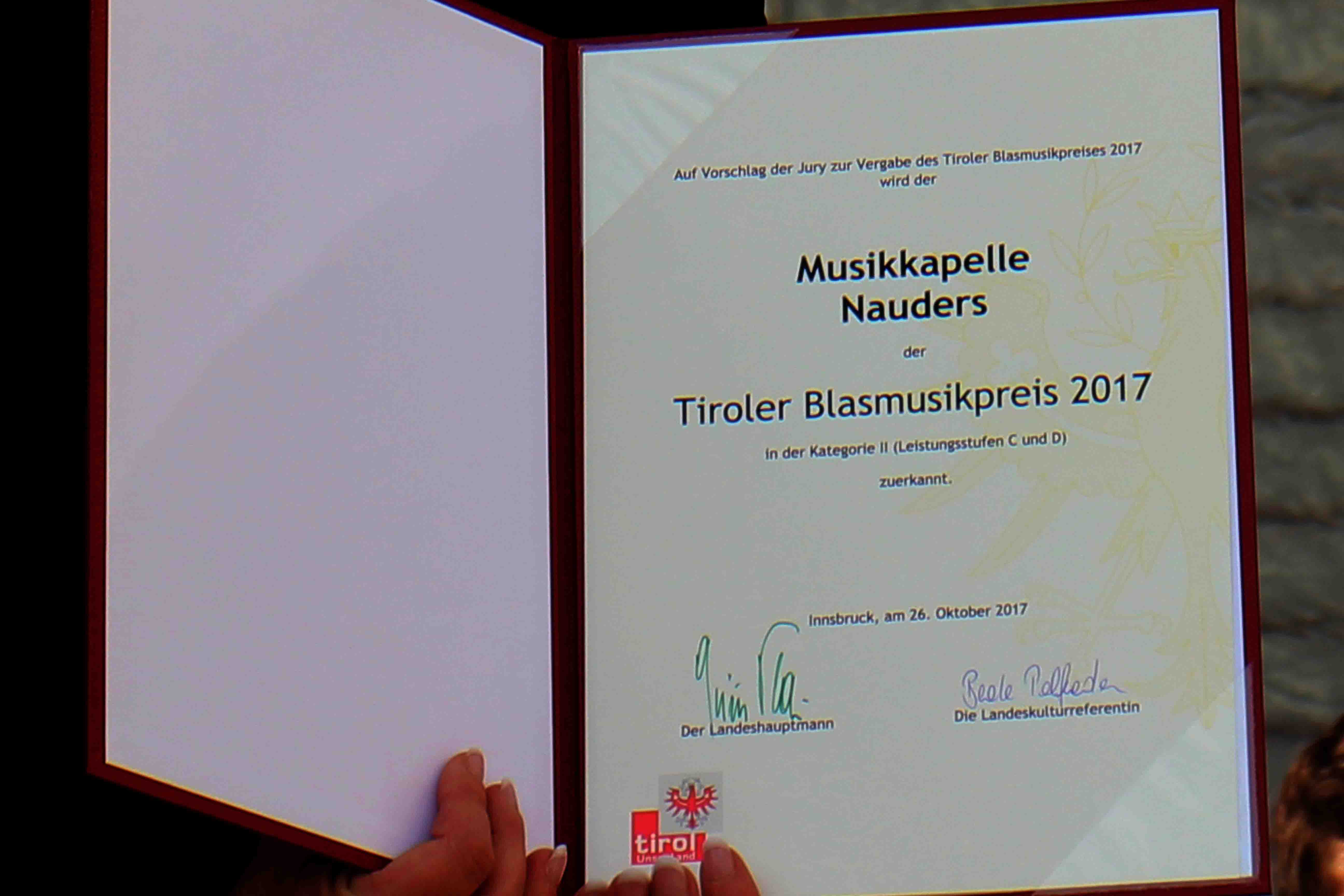 Am Nationalfeiertag, Donnerstag den 26.10.2017 wurde anlässlich des Tages der offenen Tür beim Tiroler Landhaus der Tiroler Landespreis für Blasmusik (Tiroler Blasmusikpreis) vergeben. Der Preis wurde zwei Tiroler Musikkapellen aufgrund von eingegangenen Bewerbungen, von einer Fachjury des Landes Tirol zuerkannt. Berücksichtigt wurden alle Leistungen die die Kapelle in den vergangenen fünf Jahren erbracht hat. Die Preise wurde je für die Kategorie I (Stufe A und B) und für die Kategorie II (Stufe C und D) vergeben.